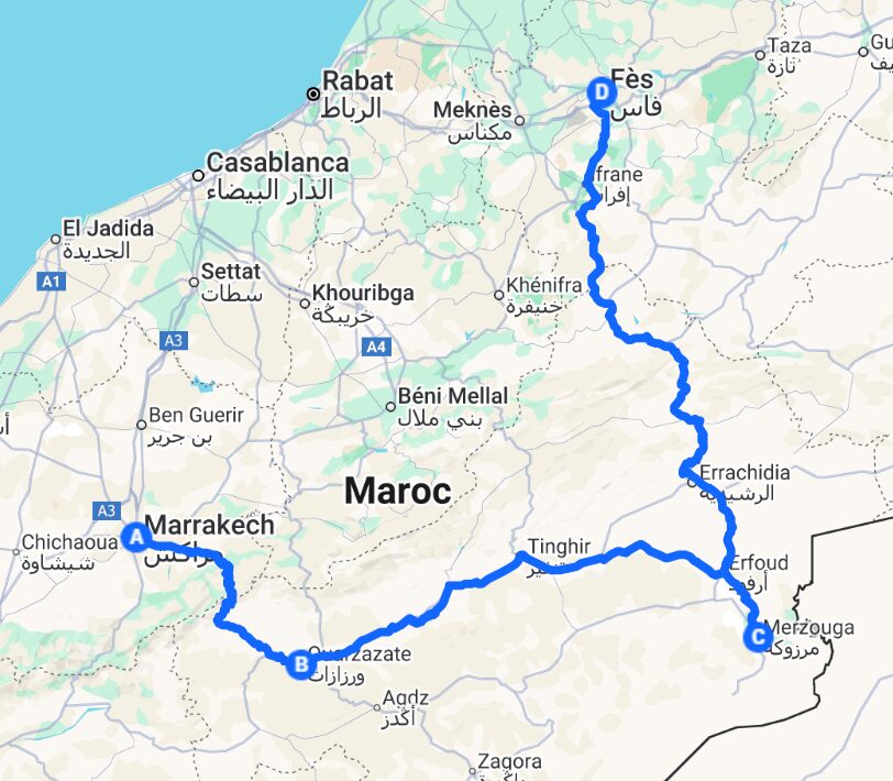 After the desert, continue north through Ziz Valley, Middle Atlas cedar forests, and arrive in Fes.