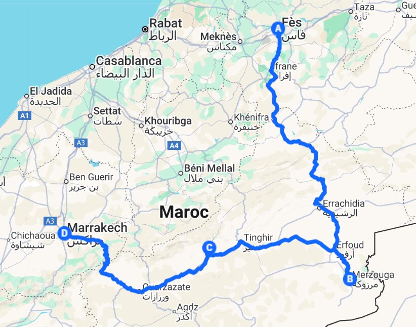 4-day tour from Fes to Marrakech (or reverse) begins in Fes, passing through Ifrane and Azrou’s cedar forests with wild monkeys. In Merzouga, camel rides over Erg Chebbi dunes include sunset/sunrise views and two nights in a desert camp with Berber music and campfires. Visits to desert villages focus on Berber culture. Route includes Todra Gorges, Dades Valley, and Ait Ben Haddou. Tour ends via Tizi-n-Tichka Pass in the High Atlas before reaching Marrakech. Includes accommodation, guides, and cultural activities.