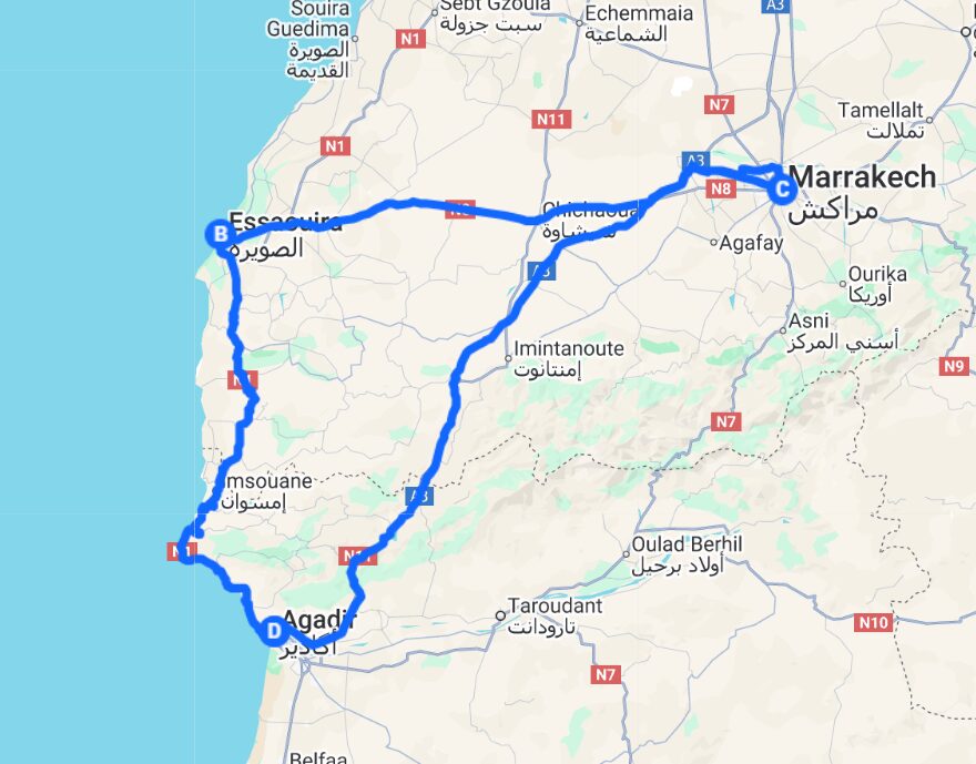4-day tour starts in Agadir and visits Essaouira and Marrakech. In Essaouira, explore the UNESCO-listed medina, historic port, artisan workshops, and sea fortifications, with cultural influences from Portuguese, French, and Berber heritage. Continue to Marrakech via an argan oil cooperative visit. In Marrakech, tour includes Saadian Tombs, Bahia Palace, Koutoubia Mosque, Majorelle Garden, the medina’s souks, and Jemaa el-Fna square. Includes guided tours and accommodation.