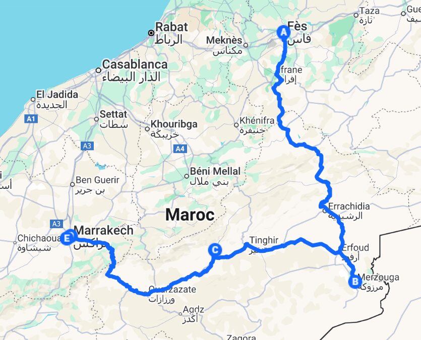 Early sunrise, breakfast at camp. Depart Sahara. First stop: Rissani visit local souk (Tues, Thurs, Sun), explore stalls, historic Alaouite origin. Continue to Erfoud stop at fossil marble workshop (marine fossils, decorative items). Pass palm groves of Touroug and Tinjdad. Walk in Todra Gorges (300m cliffs, 10m narrowest), lunch nearby. Drive to Dades Valley see “monkey fingers” rock formations, kasbahs, winding road viewpoint. Arrive Boumalne Dades, hotel check-in, dinner, optional walk.