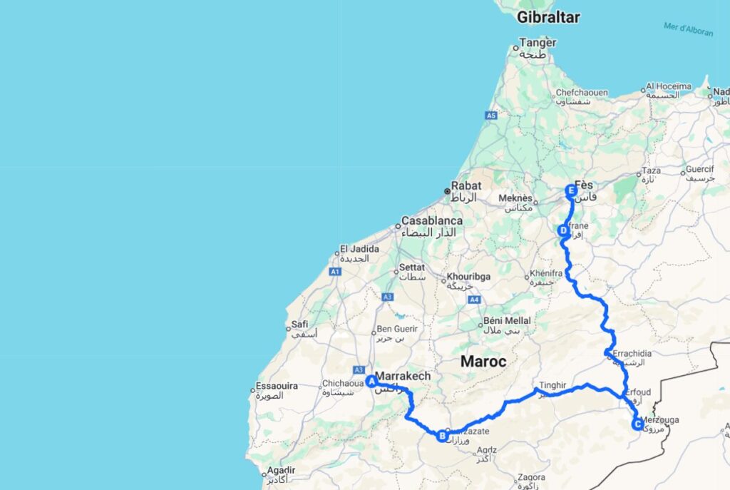 Travel to Fes over two days, with a night in Ifrane in the Middle Atlas. Route includes Ziz Valley and cedar forests with Barbary macaques.